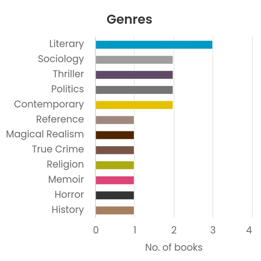 These charts are primarily from the Storygraph app, which is an alternative to the Amazon-owned Goodreads.