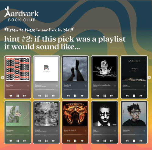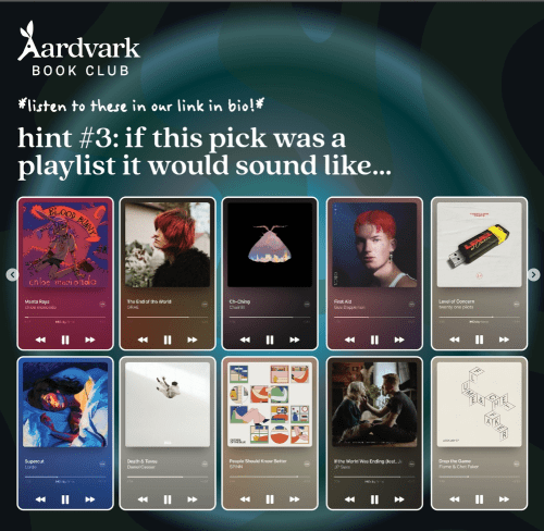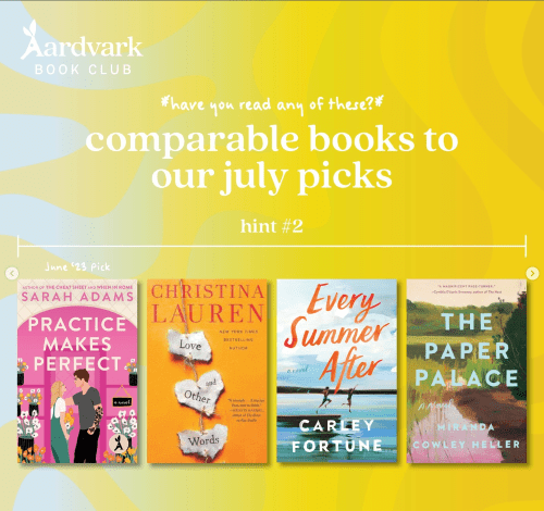 As the end of the month approaches, Aardvark Book Club starts posting hints for their upcoming month’s selection. While the type of hints changes from month-to-month, they remain fun to follow along with. I typically make guesses as to what books they will be in my Instagram stories, but I thought I would also share them here.