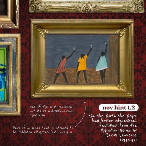 Hint 1.2 includes In the North the Negro had better educational facilities from the Migration series by Jacob Lawrence (1940-41). The painting is part of a series that is intended to be exhibited altogether but rarely is. Jacob Lawrence is one of the most renowned artists of mid-20th-center Modernism.