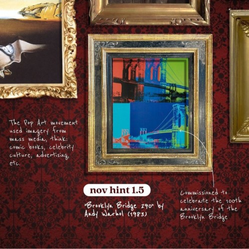 Hint 1.5 displays Brooklyn Bridge 290 by Andy Warhol (1983). The painting was commissioned to celebrate the 100th anniversary of the Brooklyn Bridge. The Pop Art movement used imagery from mass media, think: comic books, celebrity culture, advertising, etc.