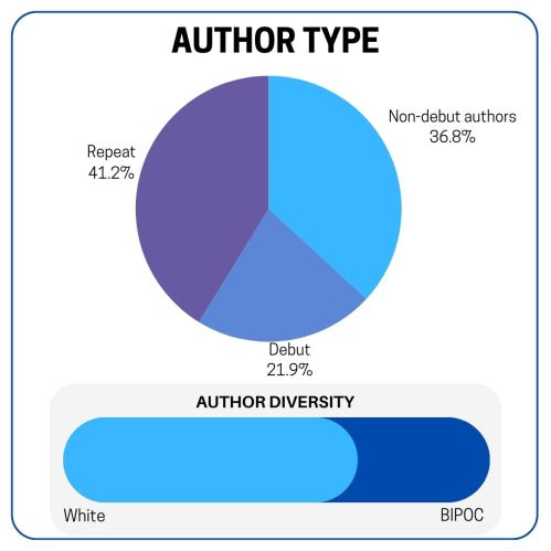 For comparison, in 2022, BOTM selected 68 main and 34 add-on books for a total of 102 books. The gender distribution was roughly the same. There were fewer BIPOC authors in 2023 compared to 2022. While the percentage of debut authors was about the same, the amount of repeat authors increased from 25.6% in 2022 to 41.2% in 2023.