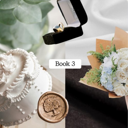 This book clearly gives wedding. The backgrounds look like fabrics, including white silk and tuxedo. There is a ring box, white flowers, a wedding cake, and a gold letter seal with a tree. I think this could be either The Wedding People or A Great Marriage, but I am leaning towards The Wedding People.