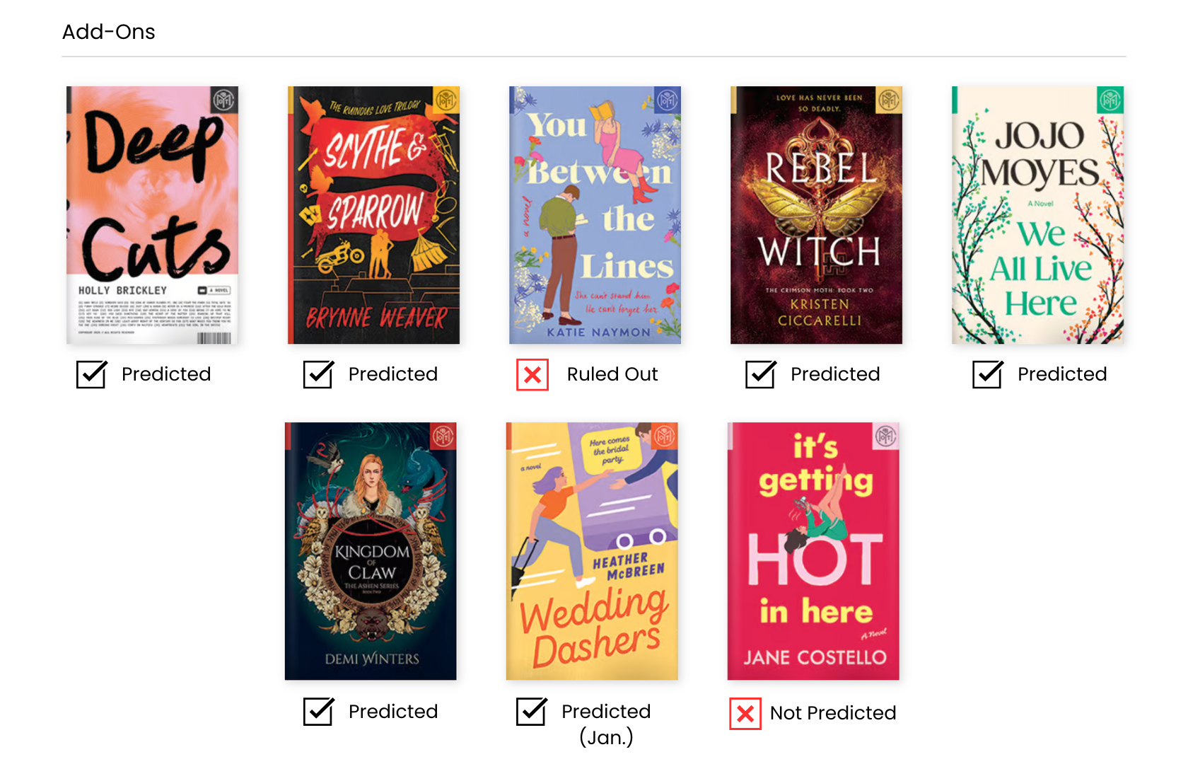 This month, I predicted 4 of the 7 main selections as well as 6 of the 8 add-ons. Obviously, this is not my best predictions month. Overall, there were only two books that I was surprised to see among the February books.