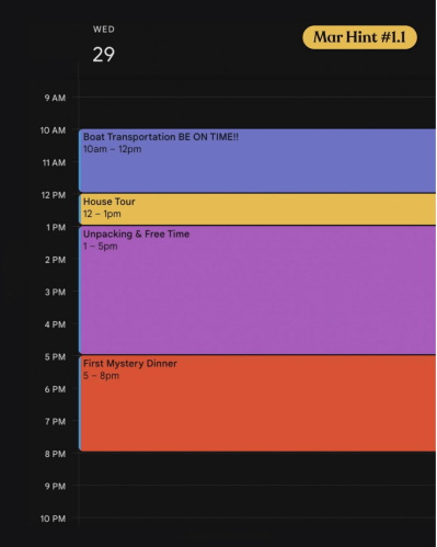 Hint 1.1: Boat Transportation; House Tour; Unpacking & Free Time; First mystery dinner