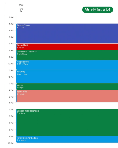 Hint 1.4: Storm-diving, Sneak Back, Chocolate + Pastries, Harpsichord, Tutoring, Lunch, Tailor Visit, Supper with Neighbors, Petit Fours for Ladies