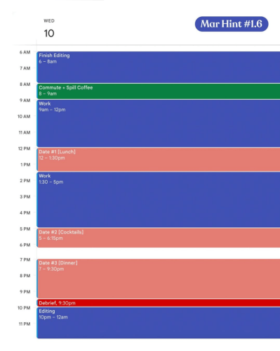 Hint 1.6: Finish Editing, Commute + Spill Coffee, Work, Date #1 [Lunch], Work, Date #2 [Cocktails], Date #3 [Dinner], Debrief, Editing