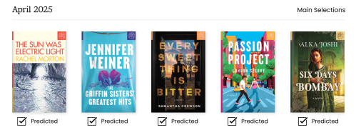 A majority of the April selections are literary and contemporary fiction, with a few other genres thrown in. I think that members who have been with the service for years may be surprised at the small number of thrillers so far this year. However, there have not been many strong thrillers to choose from so far this year. I except there to be more thriller picks over the summer.