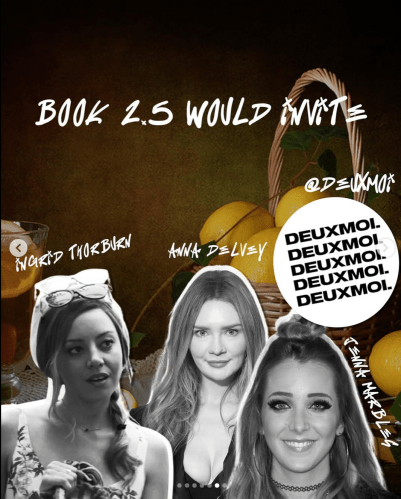 Hint 2.5: Ingrid Thornburn (Character from Ingrid Goes West, a social media stalker), Anna Delvey (Con artist & fraudster), Jenna Marbles (Former social media influencer), & Deuxmoi (Celebrity gossip social media account)