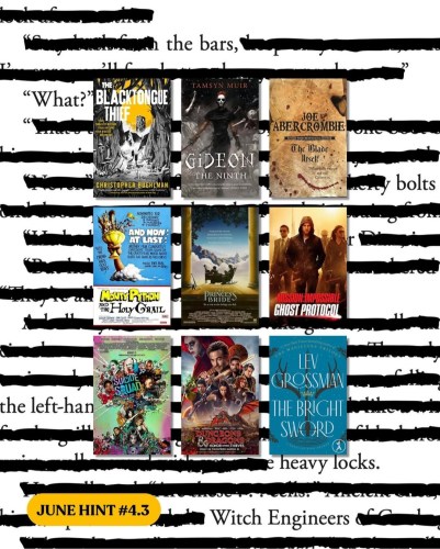 Hint 4.3: The Blacktongue Thief by Christopher Buehlman, Gideon the Ninth by Tamsyn Muir, The Blade Itself by Joe Abercrombie, Monty Python & the Holy Grail, The Princess Bride, Mission Impossible: Ghost Protocol, Suicide Squad, Dungeons & Dragons, and The Bright Sword by Lev Grossman