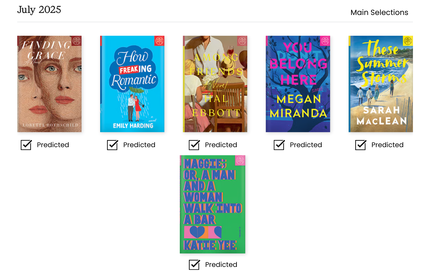 This month, I predicted all of the main selections as well as the one add-on. Essentially, none of this month’s picks were a surprise. What was a surprise was there only being one add-on and the lack of diversity in the selections. Other than one romance and one thriller novel, the rest of July’s books are either contemporary or literary fiction. It will be interesting to see if additional books are added over the course of the month.