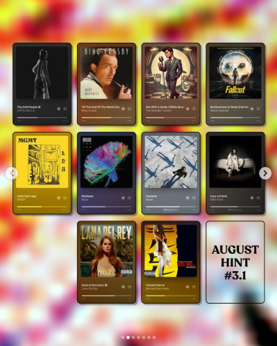 Hint 3.1: The Doll People by Sofia Isella, Til the End of the World by Bing Crosby, Die with a Smile by The Swingin’ Covers, Brootherhood of Steel by Ramin Djwadi, Little Dark Age by MGMT, Madness by Muse, Hysteria by Muse, bury a friend by Billie Ellish, Gods & Monsters by Lana Del Rey, and Twisted Nerve by Bernarnd Hermann