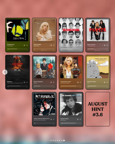 Hint 3.3: Welcome to New York (Taylor’s Version) by Taylor Swift, Blonde by Maisie Peters, Couldn’t Make It Any Harder by Sabrina Carpenter, Naked in Manhattan by Chappell Roan, 12 to 12 by sombr, Talk Too Much by Renee Rapp, get him back! by Olivia Rodrigo, Somebody I F****d Once by Zolita, Did It to Myself by Orla Gartland, and Sunset Blvd by Selena Gomez & benny blanco