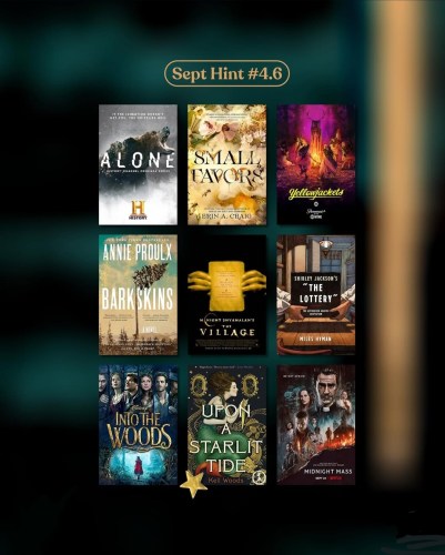 Hint 4.6: Alone, Small Favors by Erin A. Craig, Yellowjackets, Barkskins by Annie Proulx, The Village, The Lottery by Shirley Jackson, Into the Woods, Upon A Starlit Tide by Kell Woods, and Midnight Mass