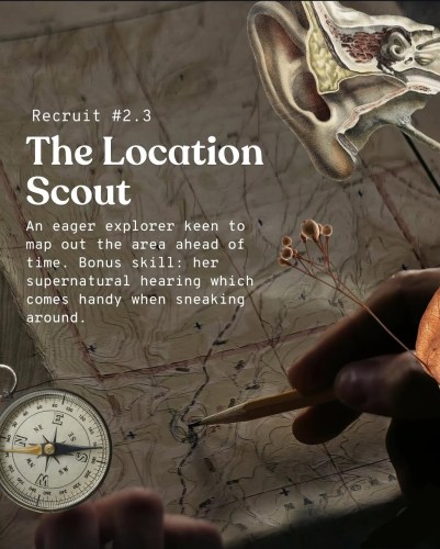 Hint 2.3: The Location Scout – An eager explorer keen to map out the area ahead of time. Bonus skills: her supernatural hearing which comes handy when sneaking around.