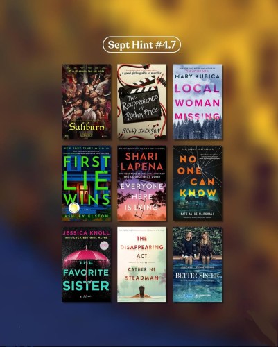 Hint 4.7: Saltburn, The Reappearance of Rachel Price by Holly Jackson, Local Woman Missing by Mary Kubica, First Lie Wins by Ashley Elston, Everyone Here Is Lying by Shari Lapena, No One Can Know by Kate Alice Marshall, The Favorite Sister by Jessica Knoll, The Disappearing Act by Catherine Steadman, and The Better Sister