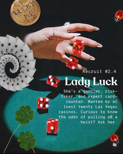 Hint 2.4: Lady Luck – She’s a gambler, risk-taker, and expert card-counter. Wanted by at least 20 Las Vegas casinos. Curious to know the odds of pulling off a heist? Ask her.