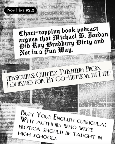 Hint 2.3: Chart-topping book podcast argues that Michael B Jordan did Ray Bradbury dirty and not in a fun way. Personals: Quietly turning pages. Looking for my co-author in life. Bury Your English Curricula: Why authors who write erotica should be taught in high schools.