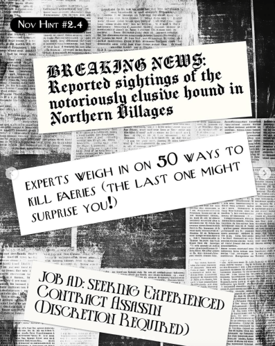 Hint 2.4: BREAKING NEWS: Reported sightings of the nortoriously elusive hound in Northern Villages. Experts weigh in on 50 ways to kill faeries (the last one might surprise you!) Job ad: Seeking experienced contract assassin (discretion required).
