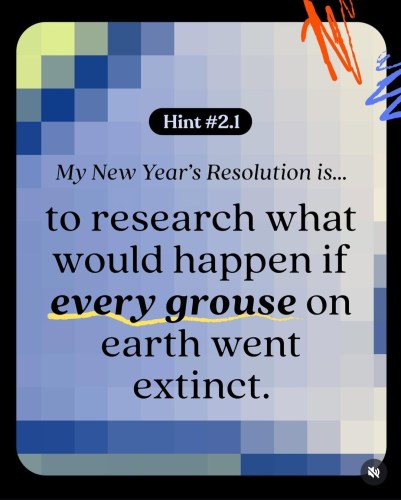 Hint 2.1: My New Year’s Resolution is to research what would happen if every grouse on earth went extinct.