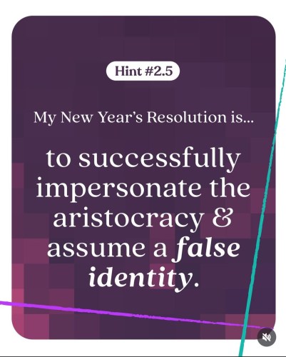Hint 2.5: My New Year’s Resolution is to successfully impersonate the aristocracy & assume a false identity.