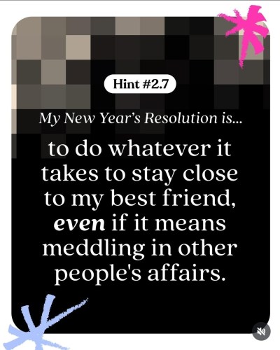 Hint 2.7: My New Year’s Resolution is to do whatever it takes to stay close to my best friend even if it means meddling in other people’s affairs.